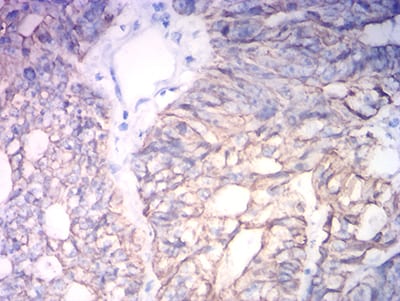 Immunohistochemical analysis of paraffin-embedded human colon cancer tissues using KRT19 mouse mAb with DAB staining.