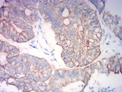 Immunohistochemical analysis of paraffin-embedded human colon cancer tissues using KRT19 mouse mAb with DAB staining.