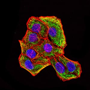 Immunofluorescence analysis of Hela cells using KRT18 mouse mAb (green). Blue: DRAQ5 fluorescent DNA dye. Red: Actin filaments have been labeled with Alexa Fluor- 555 phalloidin. Secondary antibody from Fisher (Cat#: 35503)