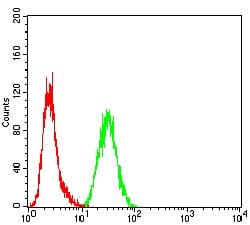 Flow cytometric analysis of Hela cells using MSH2 mouse mAb (green) and negative control (red).