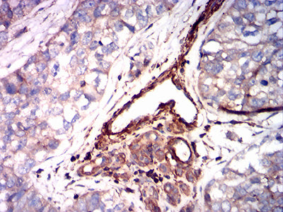 Immunohistochemical analysis of paraffin-embedded human bladder cancer tissues using ACTA2 mouse mAb with DAB staining.