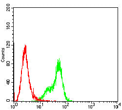 Flow cytometric analysis of Hela cells using GSTP1 mouse mAb (green) and negative control (red).