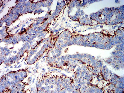Immunohistochemical analysis of paraffin-embedded human ovarian cancer tissues using PSAP mouse mAb with DAB staining.