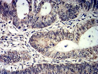 Immunohistochemical analysis of paraffin-embedded human rectum cancer tissues using TET2 mouse mAb with DAB staining.