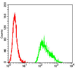 Flow cytometric analysis of Hela cells using TET2 mouse mAb (green) and negative control (red).