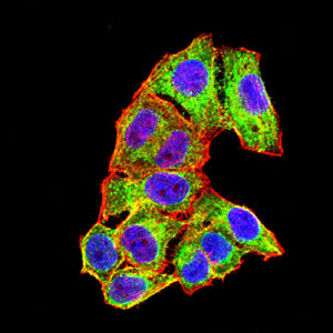 Immunofluorescence analysis of Hela cells using ALB mouse mAb (green). Blue: DRAQ5 fluorescent DNA dye. Red: Actin filaments have been labeled with Alexa Fluor- 555 phalloidin. Secondary antibody from Fisher (Cat#: 35503)
