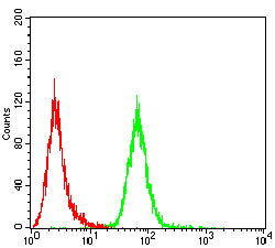 Flow cytometric analysis of HepG2 cells using ALB mouse mAb (green) and negative control (red).