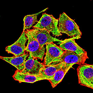 Immunofluorescence analysis of Hela cells using CD45R mouse mAb (green). Blue: DRAQ5 fluorescent DNA dye. Red: Actin filaments have been labeled with Alexa Fluor- 555 phalloidin. Secondary antibody from Fisher (Cat#: 35503)