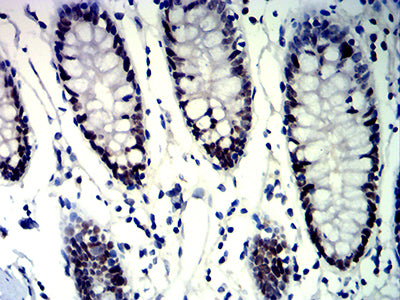 Immunohistochemical analysis of paraffin-embedded human colon tissues using MSH6 mouse mAb with DAB staining.