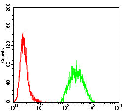 Flow cytometric analysis of Hela cells using MSH6 mouse mAb (green) and negative control (red).