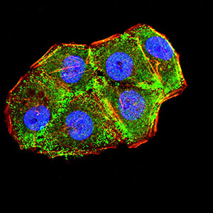 Immunofluorescence analysis of Hela cells using KRT10 mouse mAb (green). Blue: DRAQ5 fluorescent DNA dye. Red: Actin filaments have been labeled with Alexa Fluor- 555 phalloidin. Secondary antibody from Fisher (Cat#: 35503)