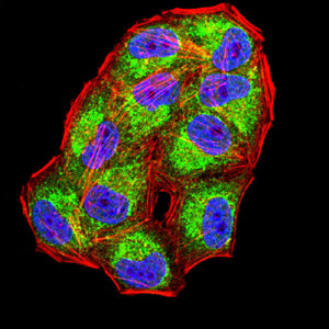Immunofluorescence analysis of Hela cells using CD1A mouse mAb (green). Blue: DRAQ5 fluorescent DNA dye. Red: Actin filaments have been labeled with Alexa Fluor- 555 phalloidin. Secondary antibody from Fisher (Cat#: 35503)