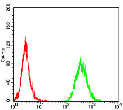 Flow cytometric analysis of MOLT4 cells using CD1A mouse mAb (green) and negative control (red).