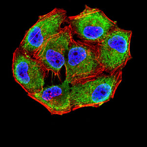Immunofluorescence analysis of Hela cells using CD47 mouse mAb (green). Blue: DRAQ5 fluorescent DNA dye. Red: Actin filaments have been labeled with Alexa Fluor- 555 phalloidin. Secondary antibody from Fisher (Cat#: 35503)
