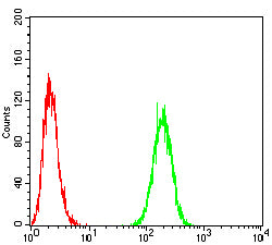 Flow cytometric analysis of Hela cells using CD47 mouse mAb (green) and negative control (red).