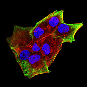 Immunofluorescence analysis of Hela cells using CCL27 mouse mAb (green). Blue: DRAQ5 fluorescent DNA dye. Red: Actin filaments have been labeled with Alexa Fluor- 555 phalloidin. Secondary antibody from Fisher (Cat#: 35503)