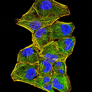 Immunofluorescence analysis of Hela cells using CD321 mouse mAb (green). Blue: DRAQ5 fluorescent DNA dye. Red: Actin filaments have been labeled with Alexa Fluor-555 phalloidin. Secondary antibody from Fisher (Cat#: 35503)