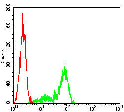 Flow cytometric analysis of Hela cells using ATP1A1 mouse mAb (green) and negative control (red).