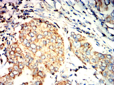Immunohistochemical analysis of paraffin-embedded human breast cancer tissues using CD319 mouse mAb with DAB staining.