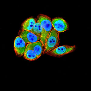 Immunofluorescence analysis of Hela cells using CDK4 mouse mAb (green). Blue: DRAQ5 fluorescent DNA dye. Red: Actin filaments have been labeled with Alexa Fluor- 555 phalloidin. Secondary antibody from Fisher (Cat#: 35503)