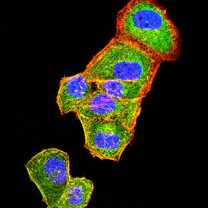 Immunofluorescence analysis of Hela cells using CD109 mouse mAb (green). Blue: DRAQ5 fluorescent DNA dye. Red: Actin filaments have been labeled with Alexa Fluor- 555 phalloidin. Secondary antibody from Fisher (Cat#: 35503)
