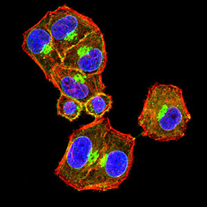 Immunofluorescence analysis of Hela cells using GOLGA2 mouse mAb (green). Blue: DRAQ5 fluorescent DNA dye. Red: Actin filaments have been labeled with Alexa Fluor- 555 phalloidin. Secondary antibody from Fisher (Cat#: 35503)