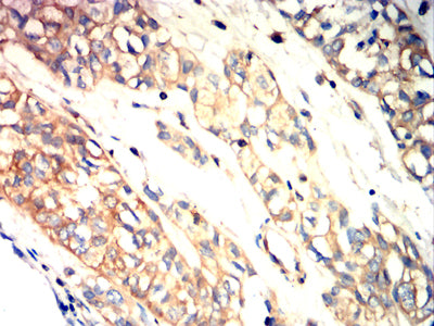 Immunohistochemical analysis of paraffin-embedded human bladder cancer tissues using TUBB1 mouse mAb with DAB staining.