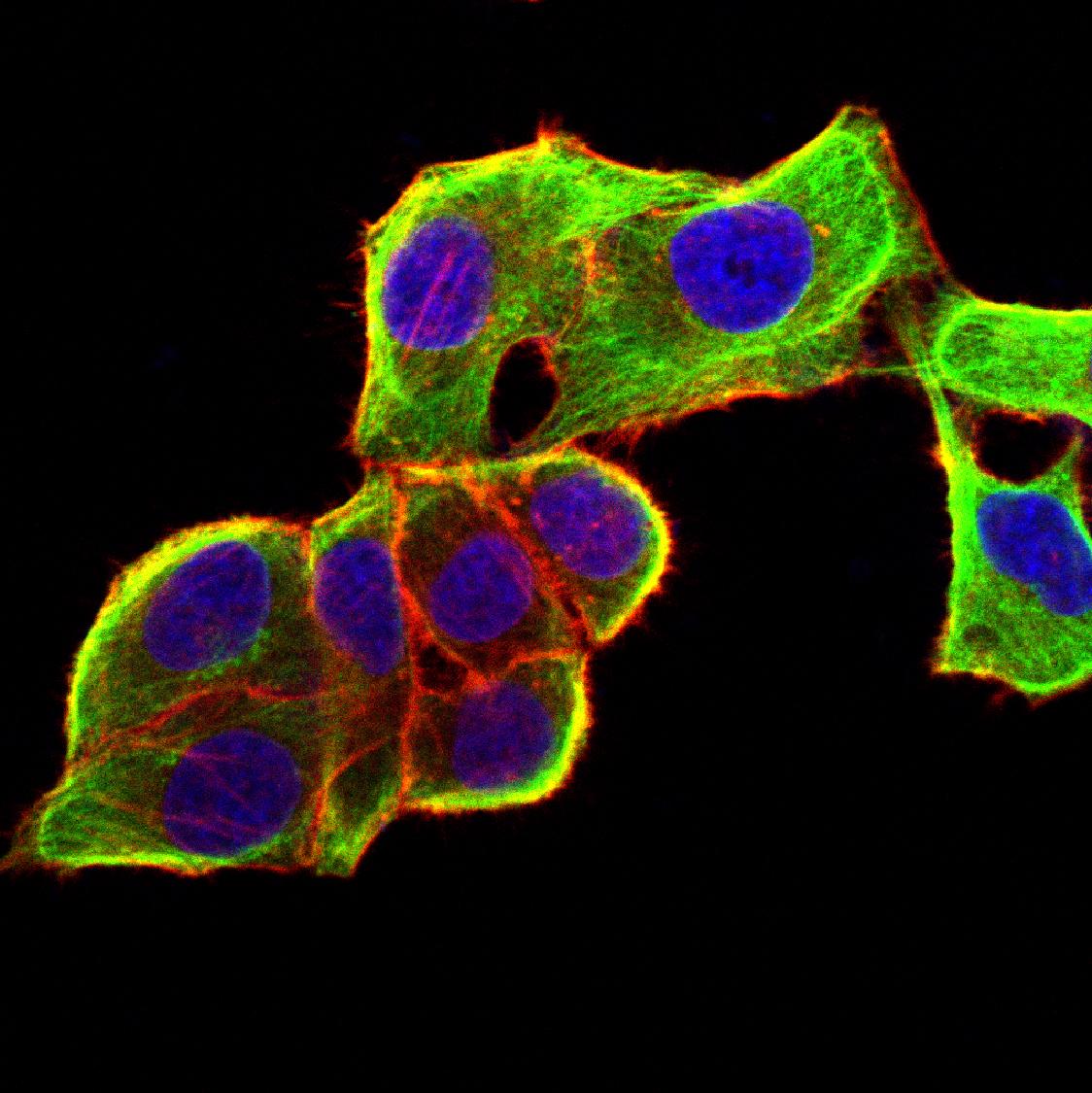 Immunofluorescence analysis of Hela cells using TUBB1 mouse mAb (green). Blue: DRAQ5 fluorescent DNA dye. Red: Actin filaments have been labeled with Alexa Fluor- 555 phalloidin. Secondary antibody from Fisher (Cat#: 35503)