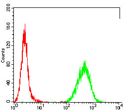Flow cytometric analysis of Hela cells using TUBB1 mouse mAb (green) and negative control (red).