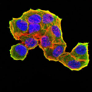 Immunofluorescence analysis of Hela cells using TRIB2 mouse mAb (green). Blue: DRAQ5 fluorescent DNA dye. Red: Actin filaments have been labeled with Alexa Fluor- 555 phalloidin. Secondary antibody from Fisher (Cat#: 35503)