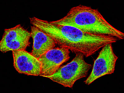 Immunofluorescence analysis of Hela cells using GPR83 mouse mAb (green). Blue: DRAQ5 fluorescent DNA dye. Red: Actin filaments have been labeled with Alexa Fluor- 555 phalloidin. Secondary antibody from Fisher (Cat#: 35503)