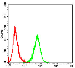 Flow cytometric analysis of Jurkat cells using HSP70 mouse mAb (green) and negative control (red).