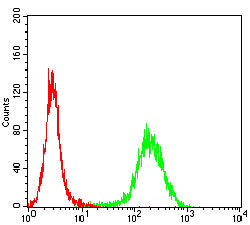 Flow cytometric analysis of Hela cells using P4HB mouse mAb (green) and negative control (red).