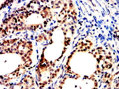 Immunohistochemical analysis of paraffin-embedded human bladder cancer tissues using HSP70 mouse mAb with DAB staining.