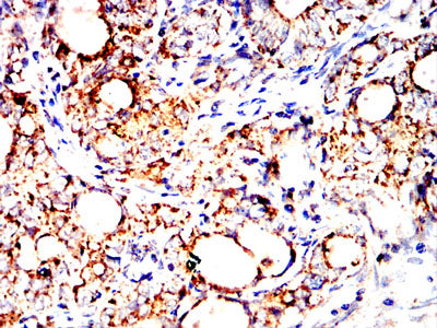 Immunohistochemical analysis of paraffin-embedded human cervical carcinoma tissues using DLL3 mouse mAb with DAB staining.