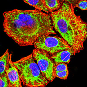 Immunofluorescence analysis of Hela cells using DLL3 mouse mAb (green). Blue: DRAQ5 fluorescent DNA dye. Red: Actin filaments have been labeled with Alexa Fluor- 555 phalloidin. Secondary antibody from Fisher (Cat#: 35503)