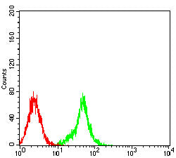 Flow cytometric analysis of C6 cells using DLL3 mouse mAb (green) and negative control (red).