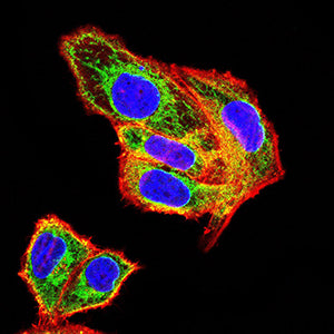 Immunofluorescence analysis of Hela cells using CD180 mouse mAb (green). Blue: DRAQ5 fluorescent DNA dye. Red: Actin filaments have been labeled with Alexa Fluor- 555 phalloidin. Secondary antibody from Fisher (Cat#: 35503)