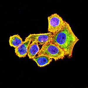 Immunofluorescence analysis of Hela cells using KRT14 mouse mAb (green). Blue: DRAQ5 fluorescent DNA dye. Red: Actin filaments have been labeled with Alexa Fluor- 555 phalloidin. Secondary antibody from Fisher (Cat#: 35503)