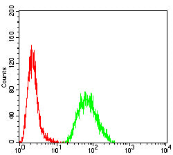 Flow cytometric analysis of Hela cells using KRT14 mouse mAb (green) and negative control (red).