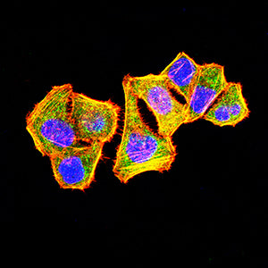 Immunofluorescence analysis of Hela cells using LAMP1 mouse mAb (green). Blue: DRAQ5 fluorescent DNA dye. Red: Actin filaments have been labeled with Alexa Fluor- 555 phalloidin. Secondary antibody from Fisher (Cat#: 35503)
