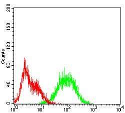Flow cytometric analysis of Hek293 cells using LAMP1 mouse mAb (green) and negative control (red).
