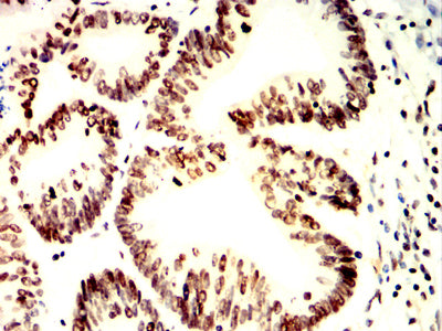 Immunohistochemical analysis of paraffin-embedded human colon cancer tissues using H2AFX mouse mAb with DAB staining.