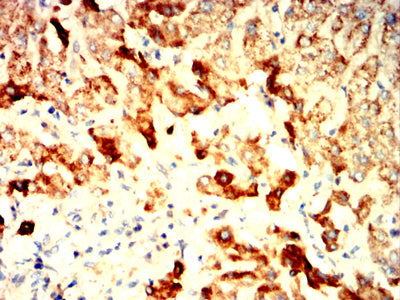 Immunohistochemical analysis of paraffin-embedded human liver tissues using EI2BG mouse mAb with DAB staining.