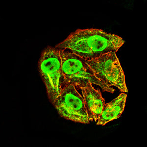 Immunofluorescence analysis of Hela cells using EI2BG mouse mAb (green). Blue: DRAQ5 fluorescent DNA dye. Red: Actin filaments have been labeled with Alexa Fluor- 555 phalloidin. Secondary antibody from Fisher (Cat#: 35503)