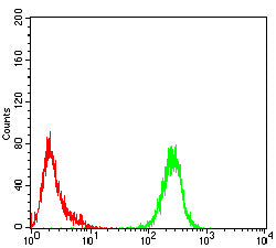Flow cytometric analysis of HL-60 cells using EI2BG mouse mAb (green) and negative control (red).