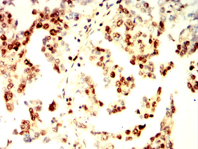 Immunohistochemical analysis of paraffin-embedded human ovarian cancer tissues using RAD23B mouse mAb with DAB staining.