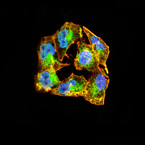 Immunofluorescence analysis of Hela cells using RAD23B mouse mAb (green). Blue: DRAQ5 fluorescent DNA dye. Red: Actin filaments have been labeled with Alexa Fluor- 555 phalloidin. Secondary antibody from Fisher (Cat#: 35503)