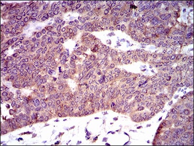 Immunohistochemical analysis of paraffin-embedded human ovarian cancer tissues using PDE1B mouse mAb with DAB staining.