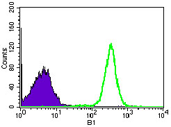 Fow cytometric analysis ofHEK293 cells using WHSC2 mouse mAb (green) and negative contro(purple).